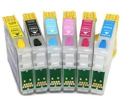 Перезаправляемые картриджи по форме похожи на оригинальные и отличаются от них внутреннем устройством и авточипами. На каждом картридже имеется автообнуляемый чип, но работают чипы только комплектом, т.е. Вы не можете использовать картриджи по отдельности вместе с оригинальными. Перезаправляемые картриджи работают только комплектом. Заправка перезаправляемых картриджей сводится к заливке чернил в заправочное отверстие.